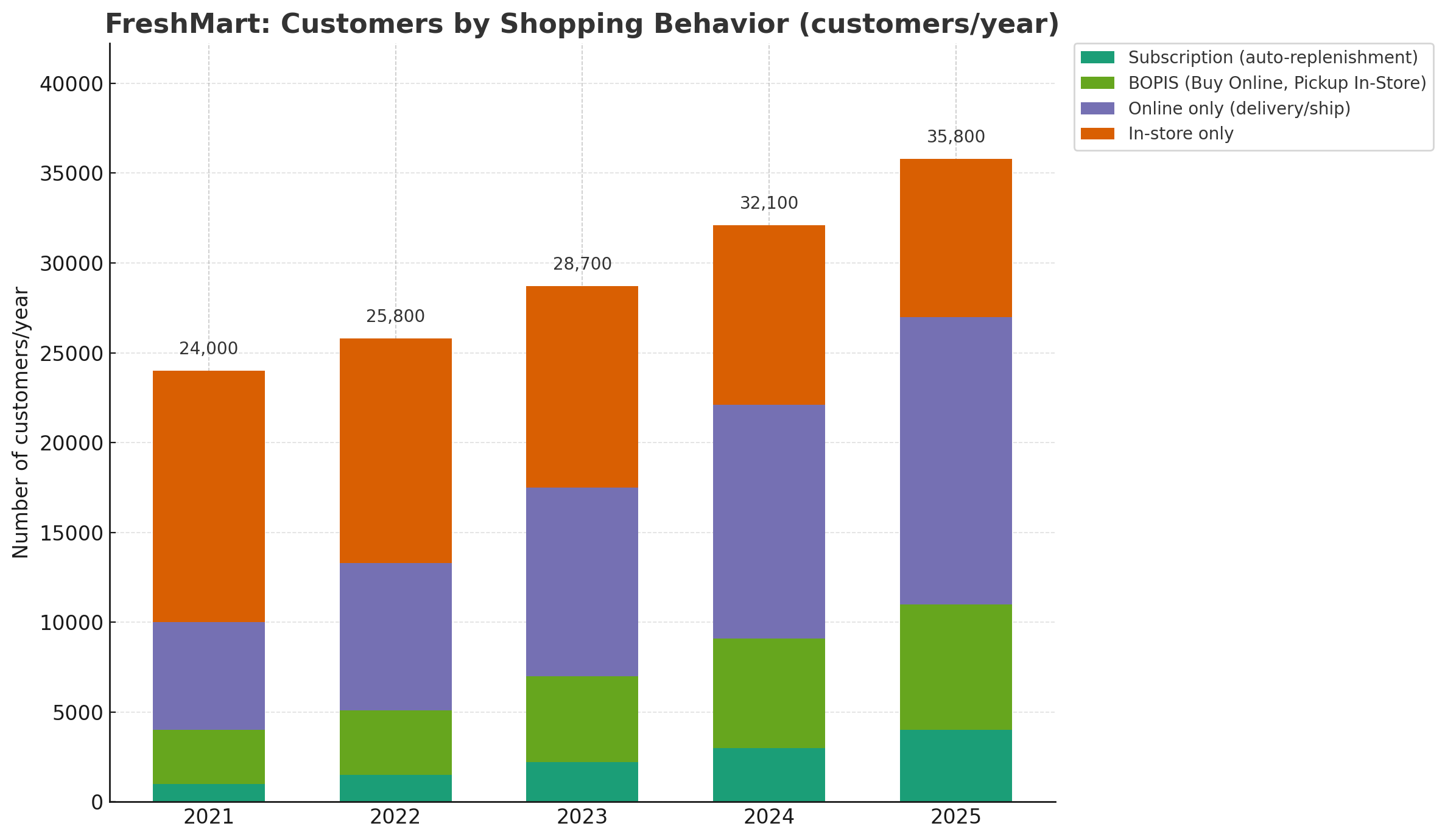 Your client, FreshMart, sells both in-store and online. The exhibit breaks customers into four mutually exclusive behaviors: In-store only, Online only (delivery/ship), BOPIS (buy online, pick up in-store), and Subscription (auto-replenishment). Totals vary by year.