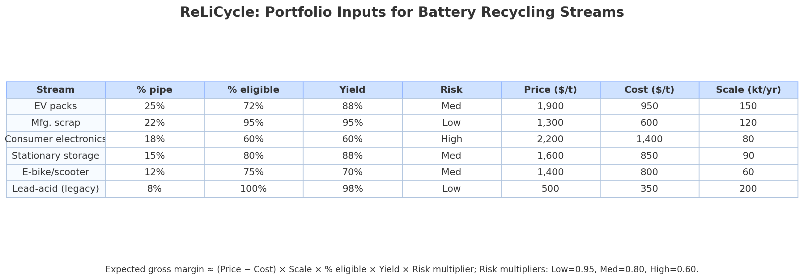 EV packs ($950/t, 150 kt, Med), Manufacturing scrap ($700/t, 120 kt, Low), Stationary storage ($750/t, 90 kt, Med). Others are smaller or penalized by High risk/low margin.
