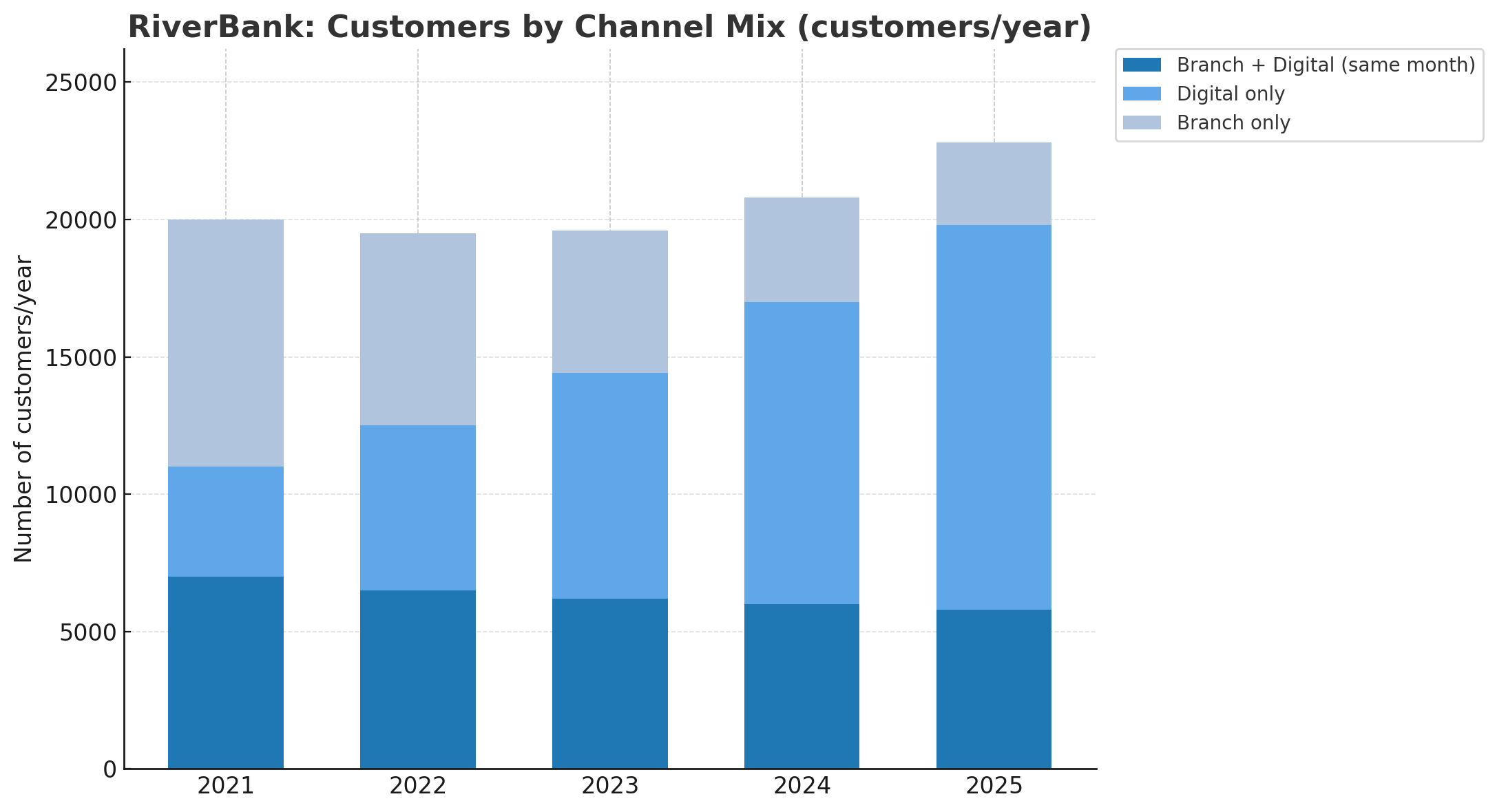 Your client is RiverBank, a national retail bank. The exhibit shows the number of customers per year from 2021–2025, segmented into three behaviors: Branch + Digital (same month), Digital only, and Branch only.